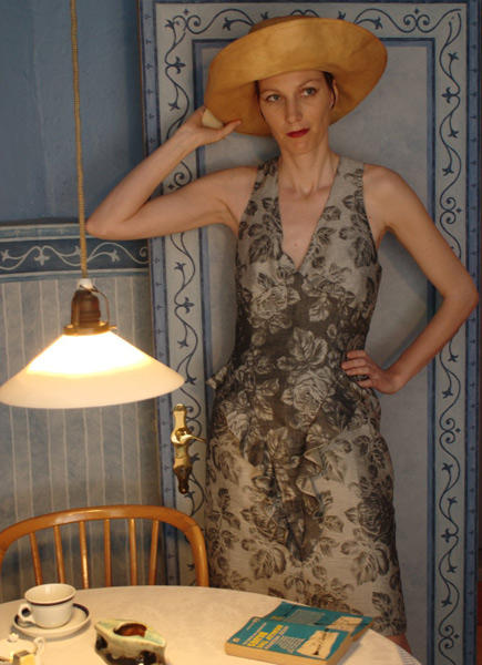 Das Kleid „Blooming Dale“ besteht aus silberfarbenen Leinen mit eingewebten Rosenmuster in schwarz. Um die Hüften schwingt sich ein dezentes Volantband aus dem gleichen Stoff.
